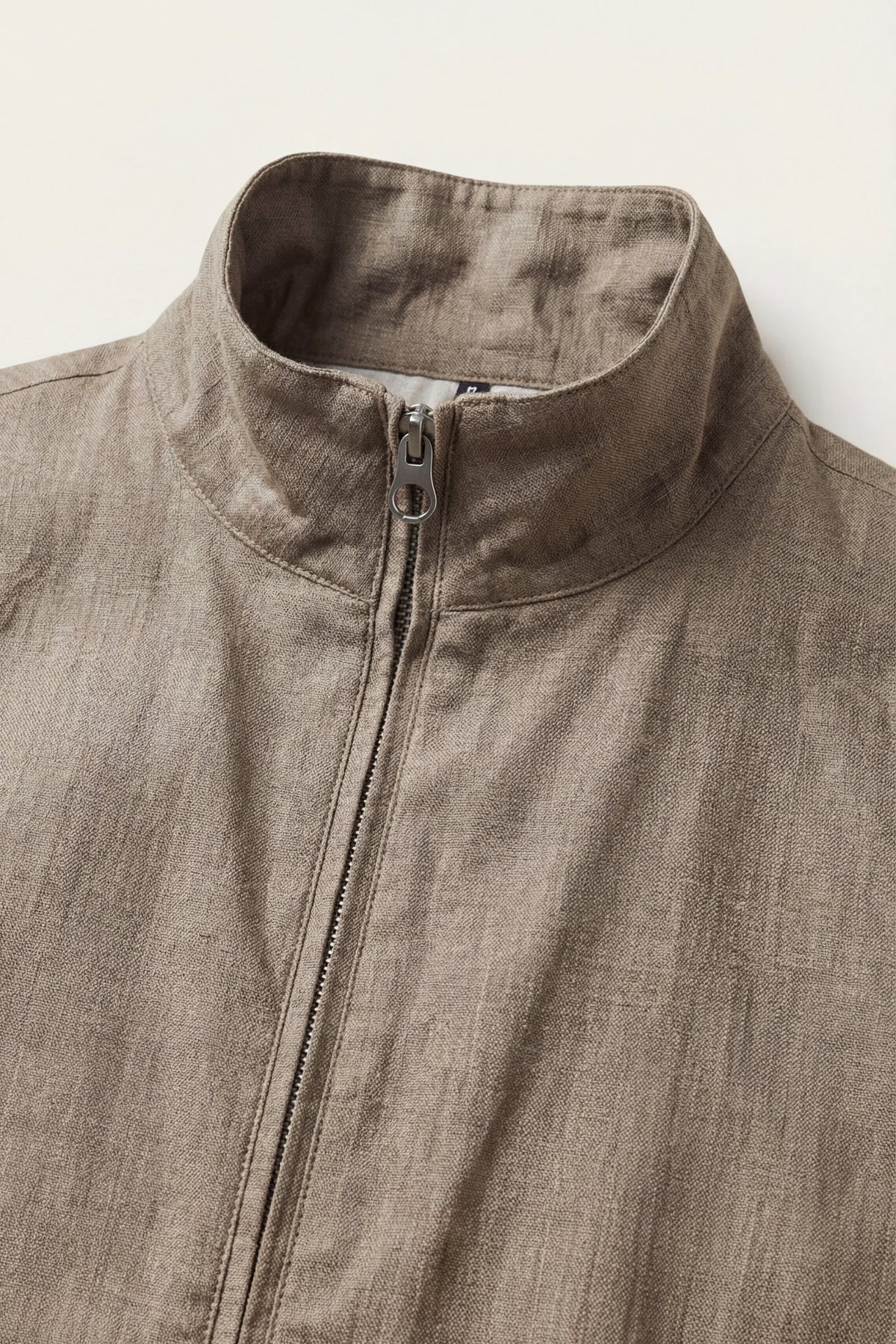 A lightweight spring jacket shaped with a slim, composed silhouette and an easy, breathable structure. Crafted from pure linen, the fabric has a natural, softly textured surface that allows air to circulate freely, offering comfort in mild, transitional conditions. A clean stand collar and minimal detailing maintain a refined profile suited for everyday city wear and travel.