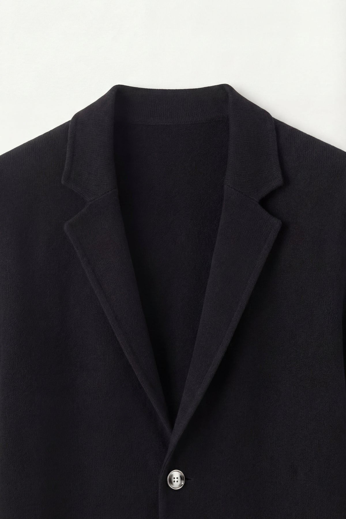 A softly structured lounge set crafted from pure cashmere, offering a calm matte surface, natural warmth, and a refined, fluid drape. The buttoned cardigan and jogger trousers are balanced in tone and proportion, forming a minimal, architectural silhouette with subtle tonal contrast. Designed for quiet ease, the set moves effortlessly between home, travel, and everyday comfort, embodying understated luxury with a composed presence.