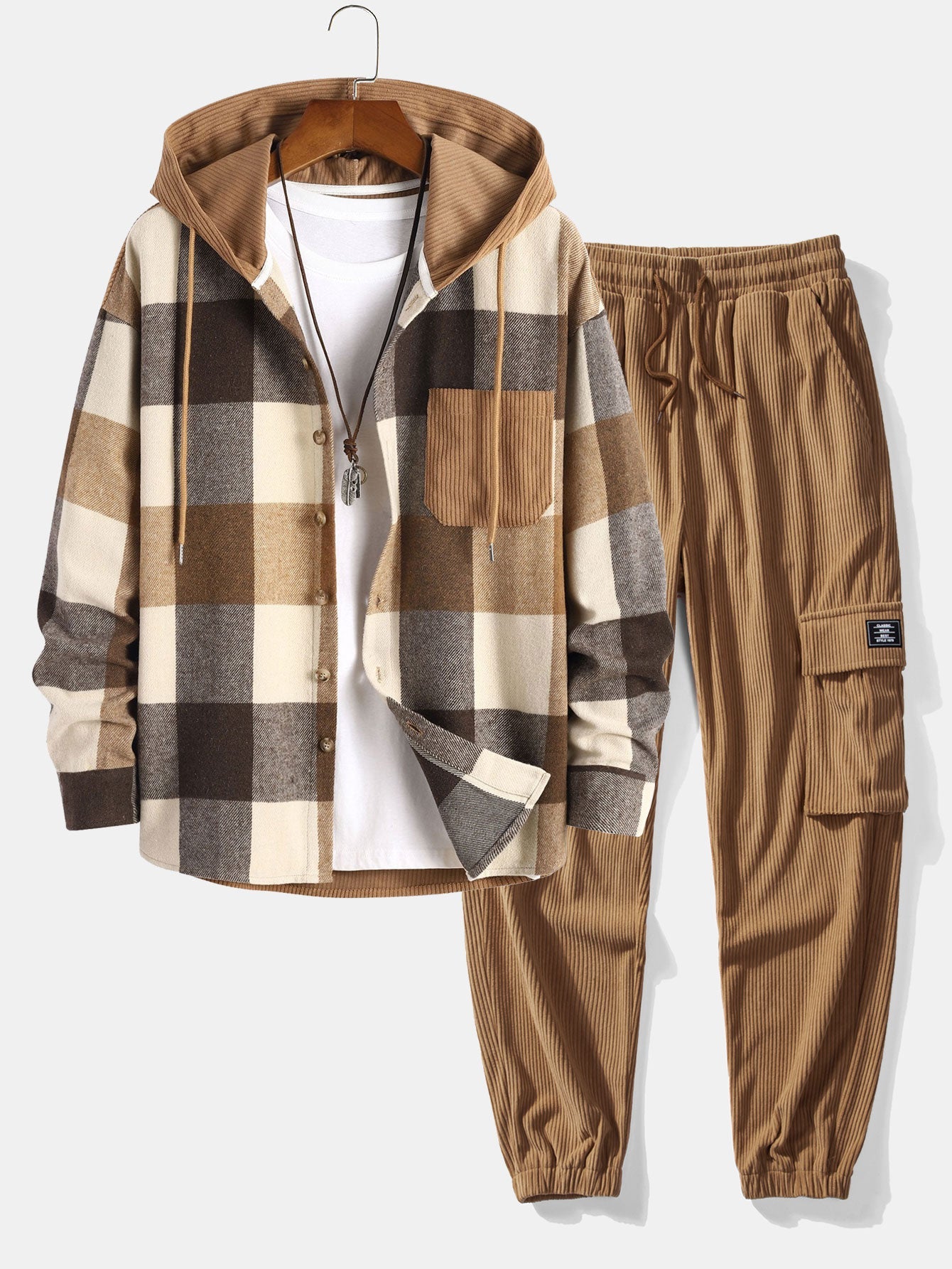 Relax Fit Flannel Ruit Corduroy Patchwork Hoodie Shirt & Corduroy Cargo Jogger Broek