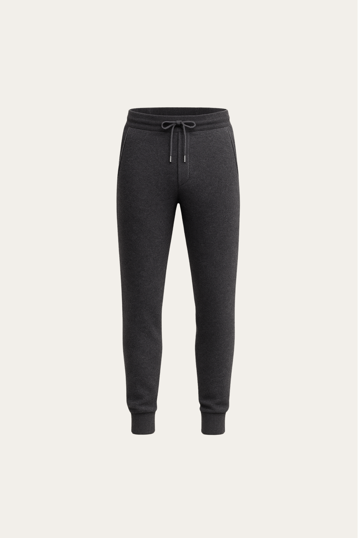 Softly sculpted lounge trousers crafted from pure, ultra-soft cashmere. The knit is smooth, warm, and gently elastic, offering a calm matte surface with exceptional comfort. A refined ribbed waistband with adjustable drawcord ensures a precise fit, while the tapered leg maintains a balanced and minimal silhouette, an essential expression of relaxed luxury.