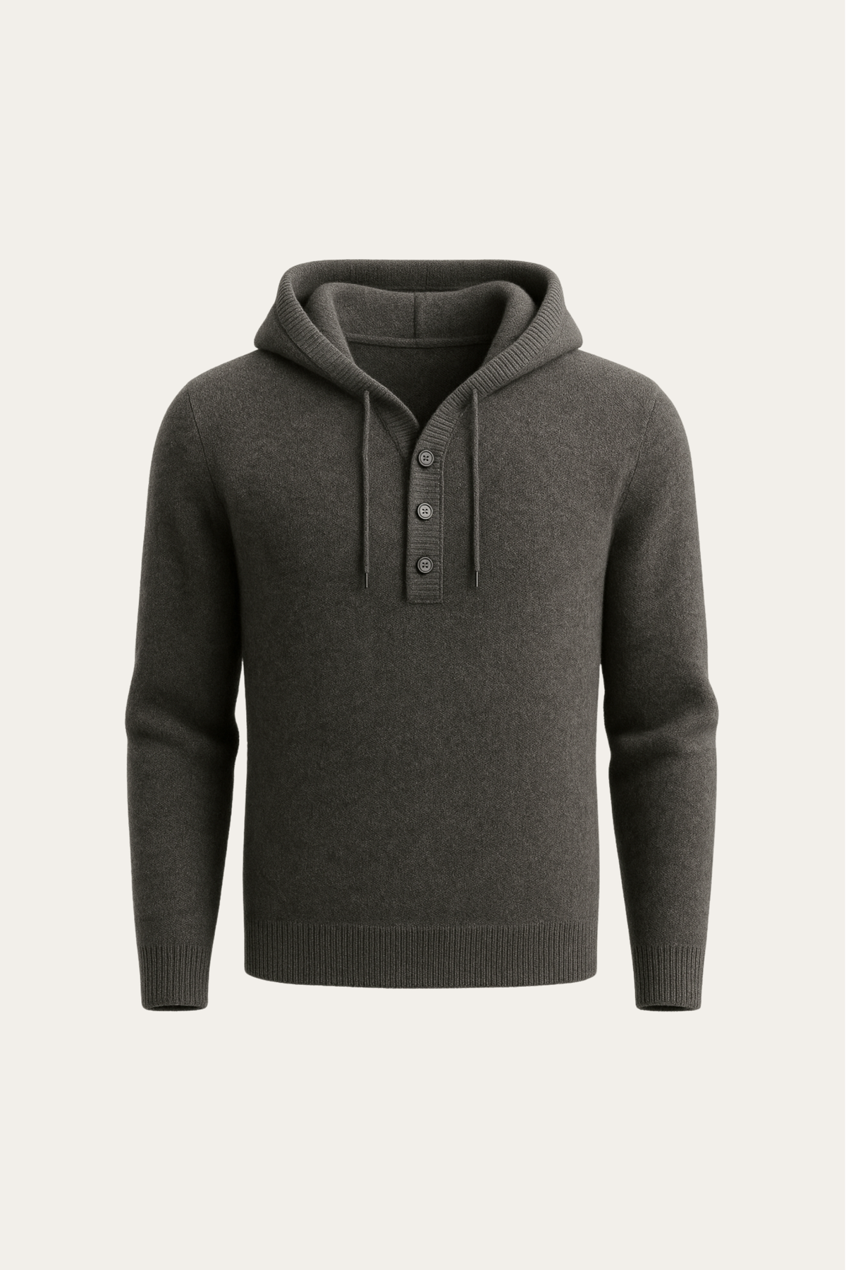 A softly structured hooded knit crafted from premium merino wool, shaped with warmth, clarity, and quiet refinement. The surface is smooth with a calm matte finish, while the naturally soft knit offers comfort without weight. Subtle button detailing and clean rib edges preserve a balanced, minimal silhouette.