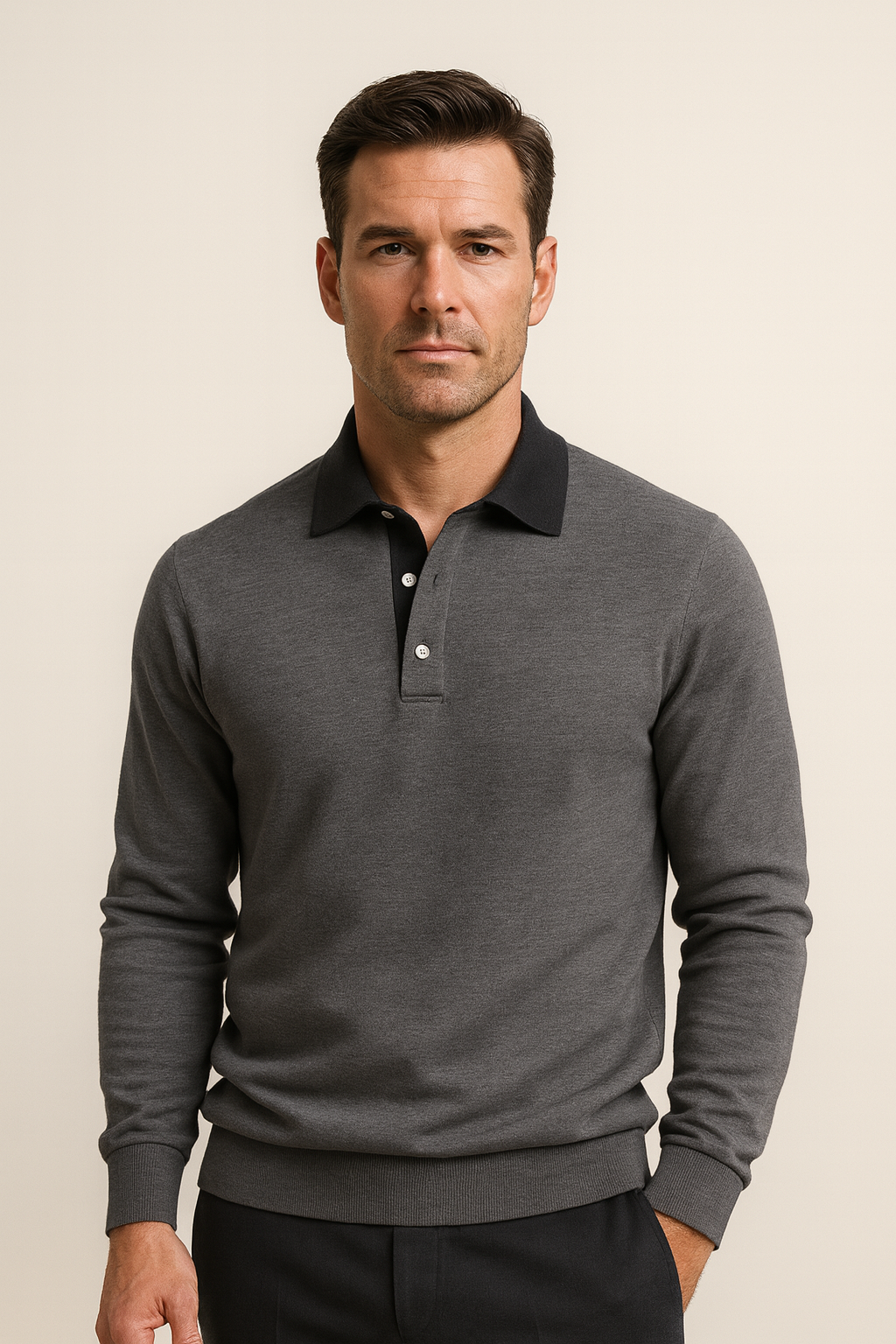 A structured long-sleeve polo shaped with quiet precision. Crafted from dense gabardine cotton, it presents a smooth, matte surface with natural weight and breathability. The contrast collar and refined button placket define a balanced silhouette, composed for timeless versatility.